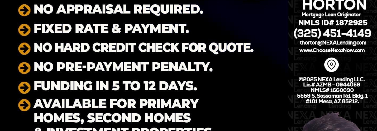 HELOC - Tyler Horton -Mortgage Loan OriginatorHi, my name is Tyler Horton. I’m a Loan Officer with NEXA Lending LLC., offering personalized mortgage solutions, fast customized quotes, great rates and service with integrity.