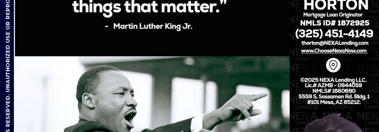 our lives MLK DAY - Tyler Horton -Mortgage Loan OriginatorHi, my name is Tyler Horton. I’m a Loan Officer with NEXA Lending LLC., offering personalized mortgage solutions, fast customized quotes, great rates and service with integrity.