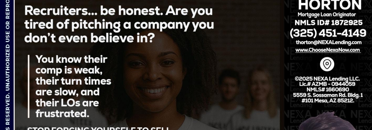 RECRUITING - Tyler Horton -Mortgage Loan OriginatorHi, my name is Tyler Horton. I’m a Loan Officer with NEXA Mortgage LLC., offering personalized mortgage solutions, fast customized quotes, great rates and service with integrity.